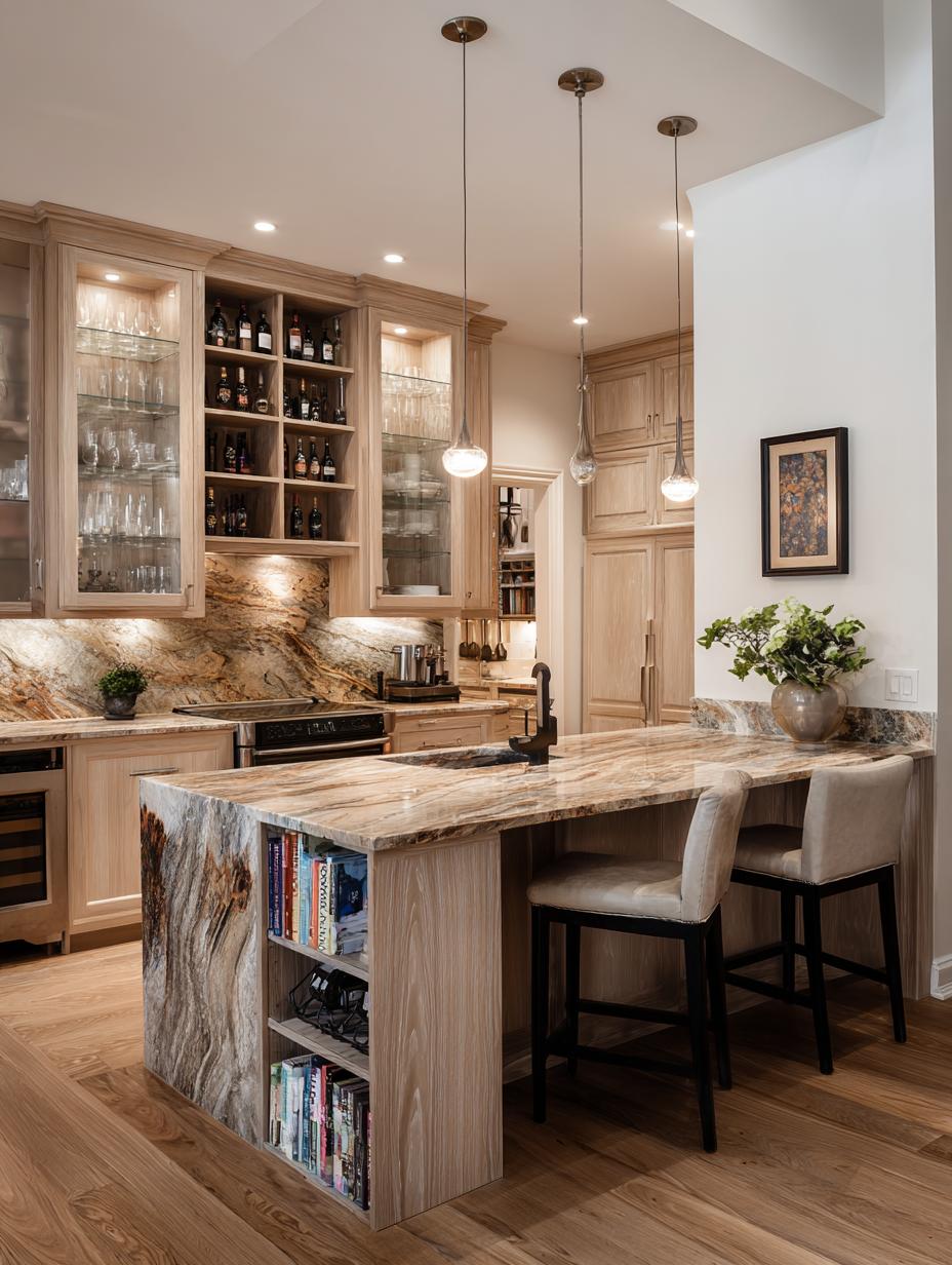 Warm oak cabinetry creates an illusion of endless space while providing exceptional storage for glassware and spirits. The dramatic veined marble countertops and backsplash add luxurious texture without overwhelming the neutral palette. Three bronze pendant lights illuminate the breakfast bar, where built-in book shelving transforms the island into a functional focal point that serves multiple purposes.