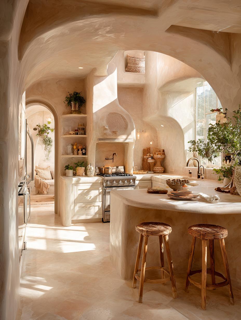Curved Adobe-Style Architecture Creates Dreamy Flow Between Kitchen and Living Areas