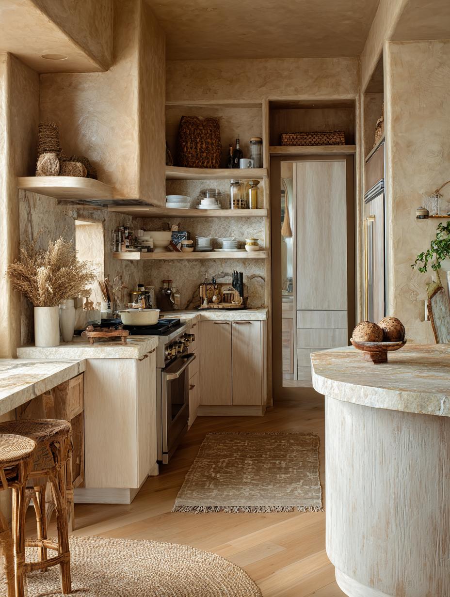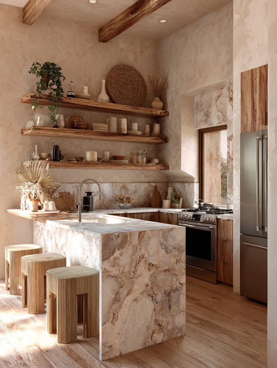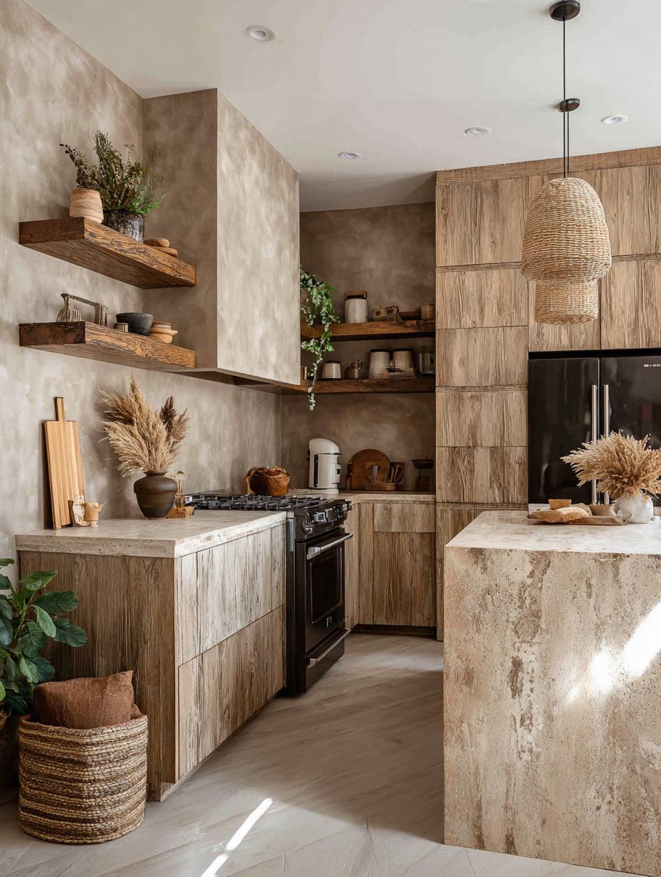 Raw travertine forms a stunning waterfall countertop that anchors this earthy kitchen design. Reclaimed wood cabinetry paired with floating shelves creates visual lightness while maximizing storage potential. Woven rattan pendant lights and ceramic vessels introduce textural contrast against the stone’s organic veining. Dried pampas grass arrangements soften hard surfaces and reinforce the natural material palette throughout.