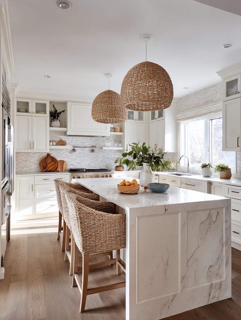 Woven Pendant Lights Transform White Marble Islands Into Boho Sanctuaries