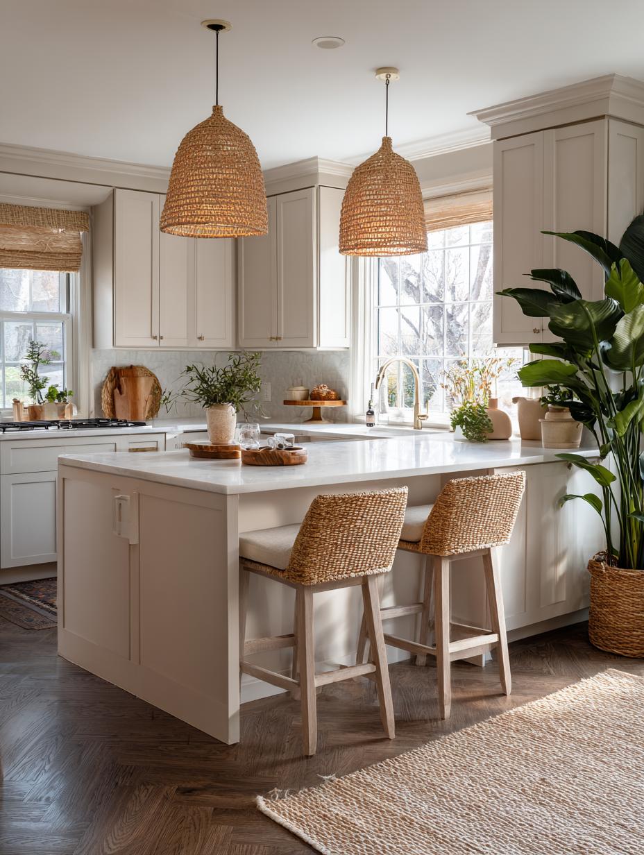 Woven Pendant Lights Transform Neutral Kitchens Into Boho Sanctuaries