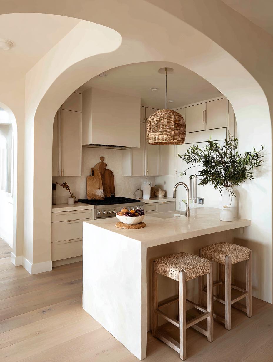 Curved archways instantly expand visual boundaries while woven pendant lighting adds bohemian texture overhead. Warm beige cabinetry paired with natural stone countertops creates an earthy foundation, while rattan bar stools introduce organic texture. Olive branches in ceramic vessels soften hard edges, proving that thoughtful material mixing transforms even modest galley layouts into sophisticated cooking spaces.