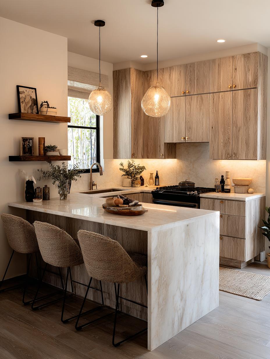 Natural walnut cabinetry pairs beautifully with dramatic marble veining to create visual depth in compact spaces. Woven pendant lights add bohemian texture while floating shelves maximize vertical storage without overwhelming the room. Bar seating transforms the island into a social hub, while warm neutral tones keep everything feeling cohesive and spacious.