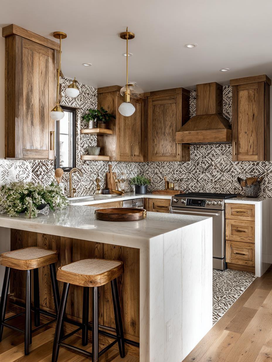 Warm Wood Cabinets Meet Bold Geometric Patterns in Perfect Boho Harmony