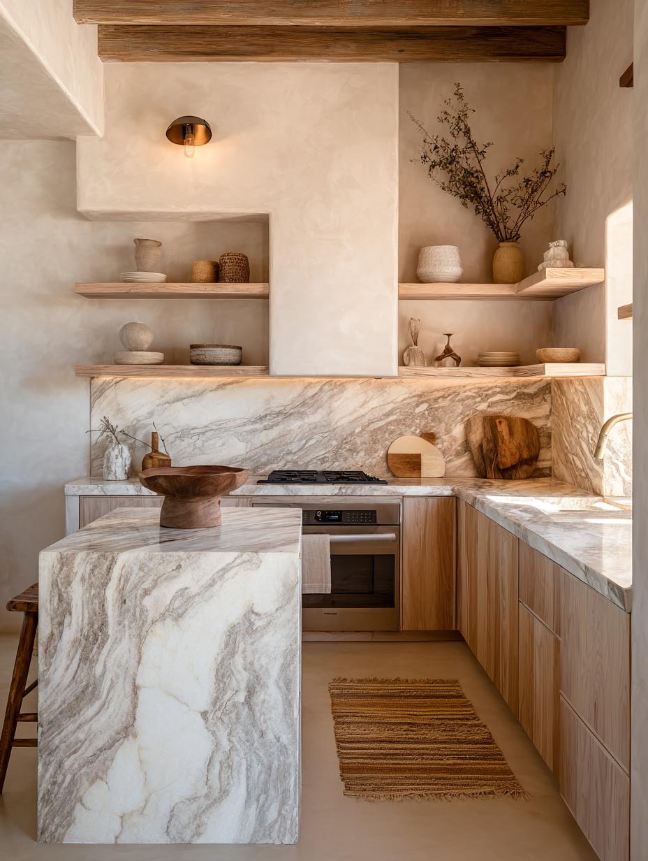 Natural walnut wood cabinetry pairs beautifully with dramatic veined marble that cascades down the island’s sides, creating visual weight and sophistication. Open floating shelves display curated ceramics and woven baskets, while exposed ceiling beams add rustic charm. Warm plaster walls and hardwood floors ground the space in earthy neutrals that feel both bohemian and refined.