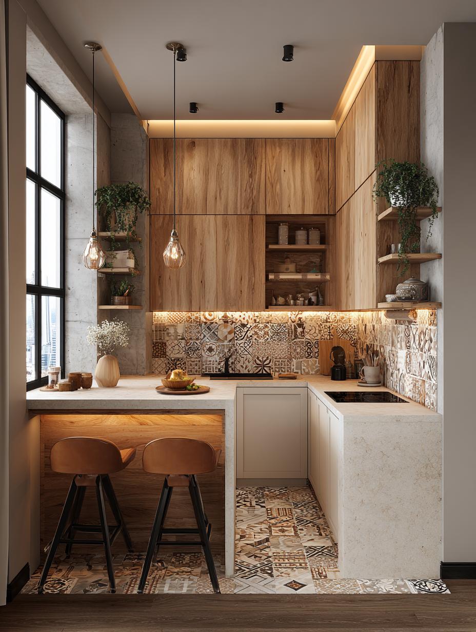 Natural walnut cabinetry creates seamless storage from floor to ceiling while intricate geometric tiles form a stunning backsplash that extends across the floor. Floating wooden shelves display cascading greenery against exposed concrete walls, and warm LED strips illuminate both upper cabinets and the breakfast bar. Two leather bar stools tuck neatly underneath the marble waterfall countertop, maximizing every square inch without sacrificing style.