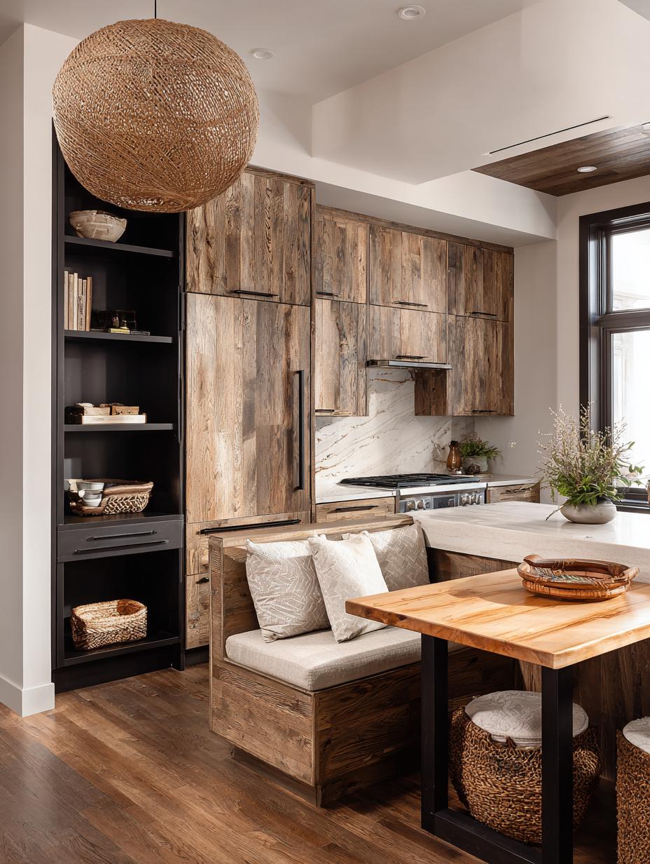 Reclaimed wood cabinetry creates dramatic vertical storage while maintaining an airy feel through strategic open shelving. Natural marble countertops and backsplash balance the rich wood tones, while a built-in banquette maximizes seating without crowding the walkways. Woven pendant lighting and rattan storage baskets infuse bohemian charm into the clean-lined design. Dark hardwood floors ground the neutral palette of creams and warm wood finishes throughout.