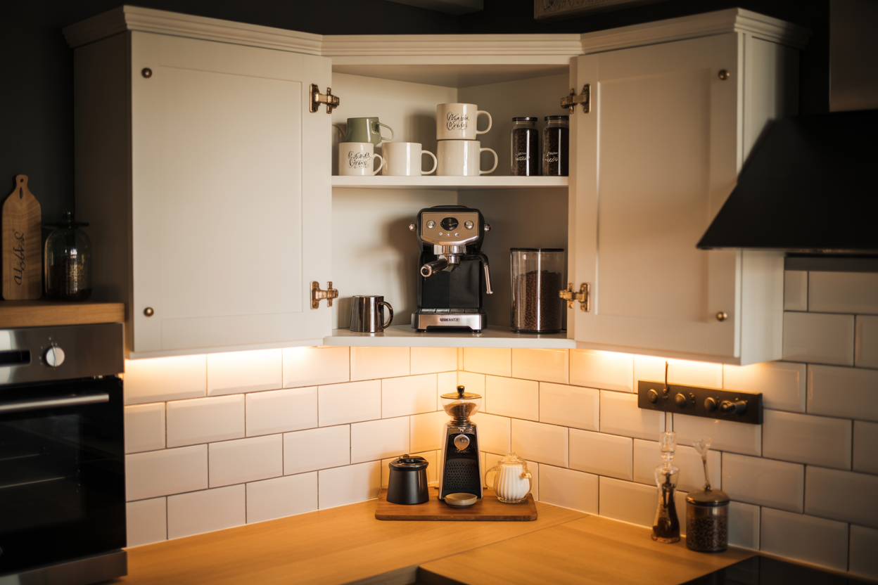 Capitalize on neglected vertical space beneath upper cabinets by installing a dedicated coffee zone that exploits what I term “shadow real estate.” Mount your coffee maker on the counter directly below cabinets, then add under-cabinet lighting to eliminate the dreary cave effect. Attach small baskets or magnetic containers to cabinet undersides for filters and pods. This layered approach creates depth perception that makes corners feel purposeful rather than forgotten, while task lighting enhances morning functionality when ambient light fails.