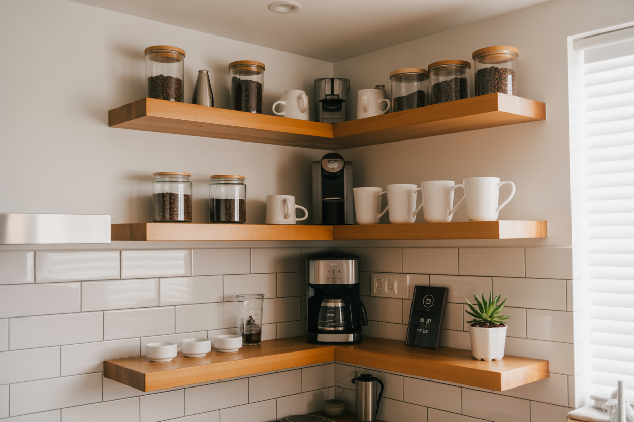 Transform dead corner space into vertical real estate with strategically placed floating shelves that create what I term “ascending functionality.” Install two or three shelves at varying heights to accommodate your coffee maker on the lowest tier, mugs hanging from underneath hooks, and supplies ascending upward. This configuration draws the eye vertically while keeping countertops clear—a psychological trick that makes kitchens feel more expansive. Choose shelves with rounded edges to soften the corner’s geometry and prevent bumped elbows during groggy morning routines.
