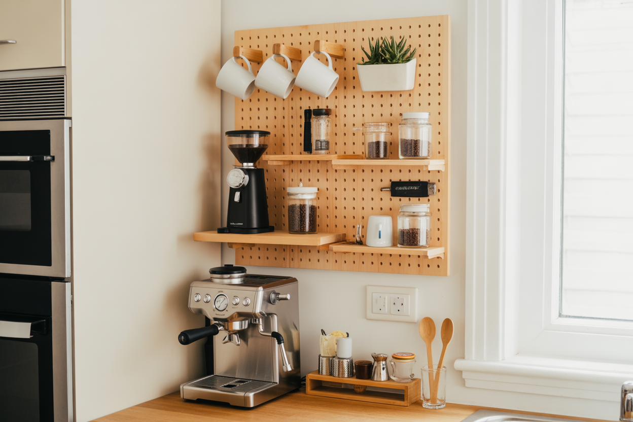 Install a corner pegboard panel to create endlessly customizable storage that adapts as your coffee collection evolves. Paint it complementary colors or leave natural wood for warmth, then arrange hooks, shelves, and containers to hold everything from mugs to milk frothers. Pegboard embodies “evolutionary design”—configurations that mature with changing needs rather than becoming obsolete. The visible organization also provides psychological satisfaction; seeing your complete coffee arsenal displayed beautifully enhances the intentionality of your morning ritual.