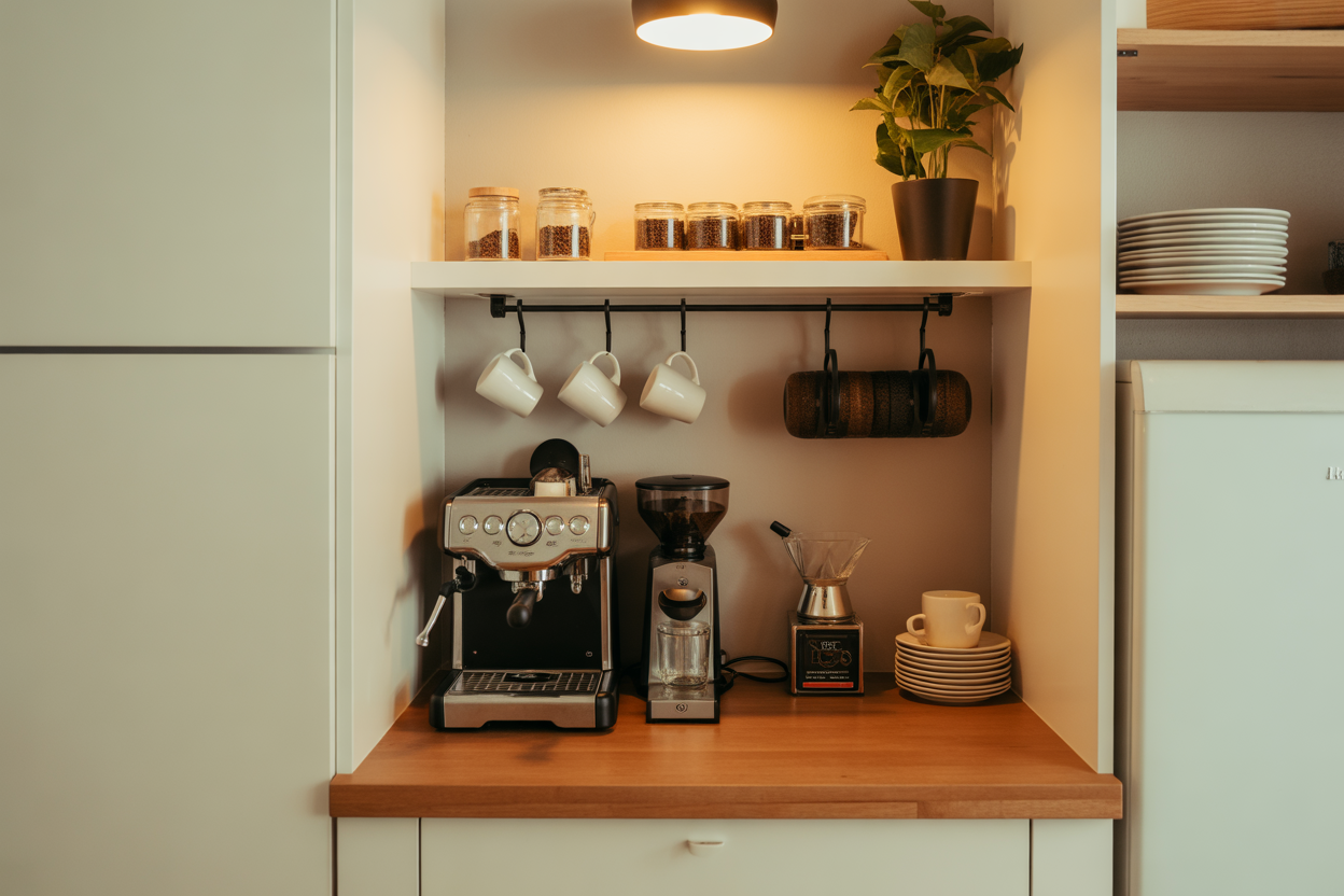 For those with slightly more corner space, install a small L-shaped countertop extension that creates dedicated coffee real estate without full cabinetry. This mini-counter juts from the wall at 15 to 20 inches, providing just enough surface for equipment and preparation space. Underneath, add floating shelves or leave open for visual lightness. This approach demonstrates “architectural punctuation”—small structural additions that define zones within open spaces, granting psychological importance to activities we value most.