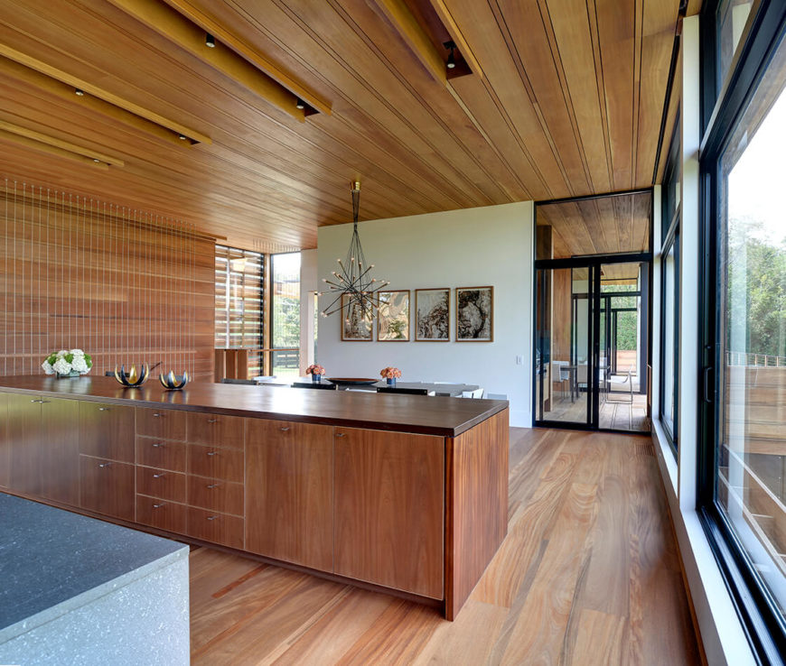 The rich hardwood flooring is complemented by minimalist paneling on the lengthy island and the ceiling, running uniformly throughout the entire home. Full height glass panels visually open the space to share the outdoors.