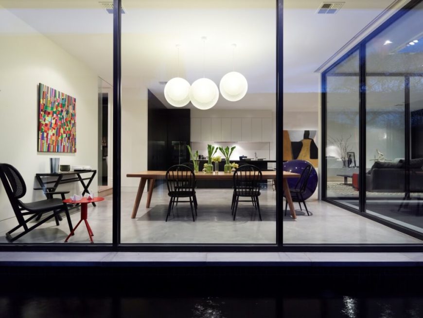 Viewed from the dining area, we see the minimalist living room setup wrapped in glass and, at left, rich dark wood wall panels. Sunlight fills this entire open space, highlighting the spare bursts of color.