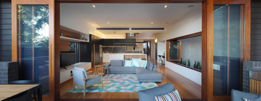The living room itself is awash in natural wood tones and bright whites. A lengthy array of retractable window panels along the right wall opens the space even more to the fresh air of outdoors.
