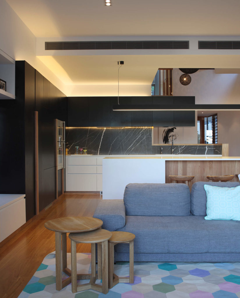 A wide profile view showcases the flow from outdoors on into the home, with natural wood and charcoal tones visually connecting the progression. The open-plan interior seamlessly blends the living and kitchen spaces.