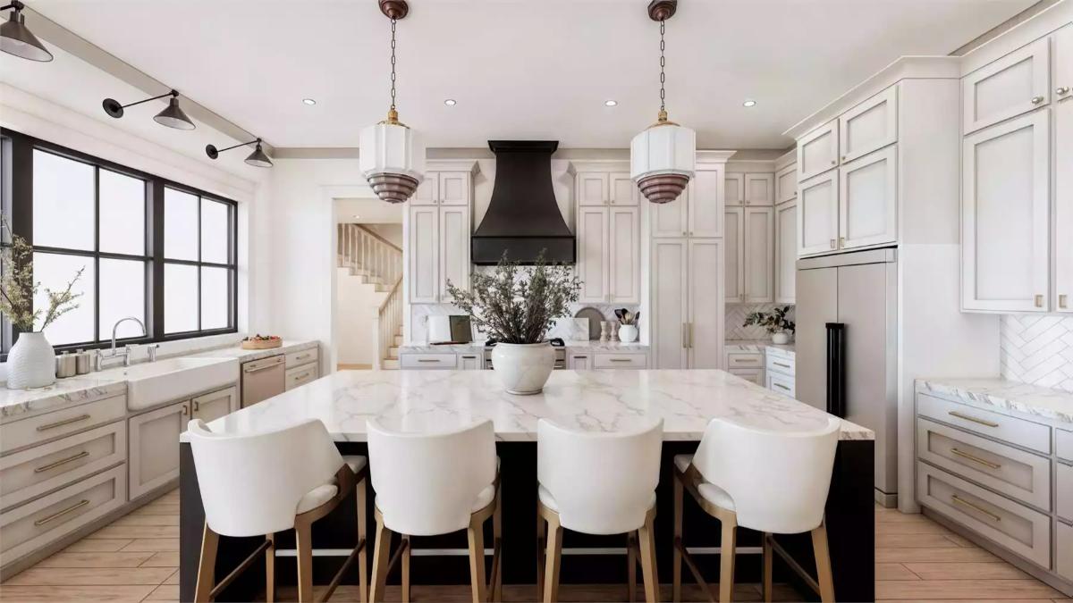 The stunning U-shaped kitchen features an expansive eating bar island and a large hidden pantry, while the gorgeous dining room is perfect for gatherings.