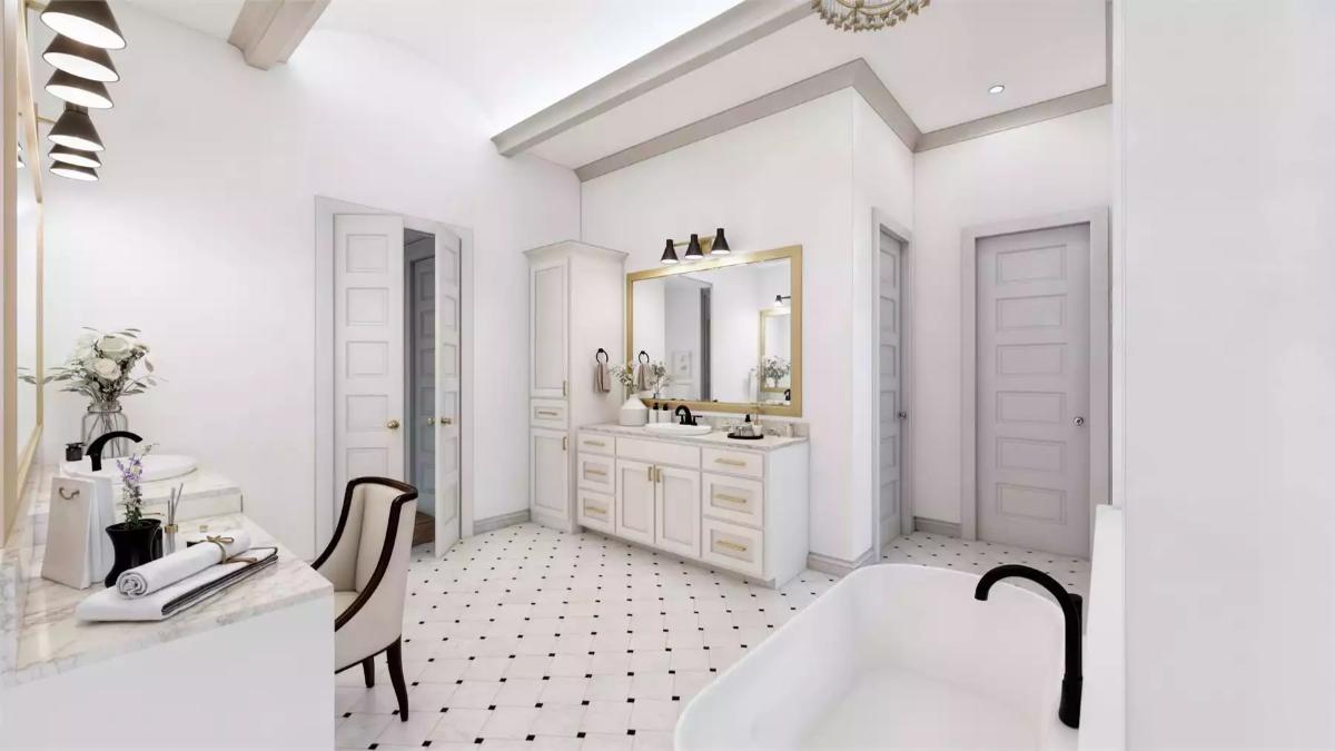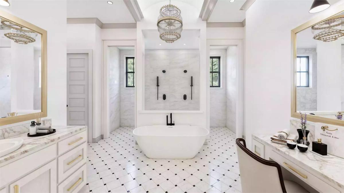 This 4-bedroom, 4.5-bathroom design welcomes you with an 18-foot ceiling foyer leading to a vaulted great room and a private home office. Each of the four bedrooms is strategically placed for privacy and includes convenient bathroom access.