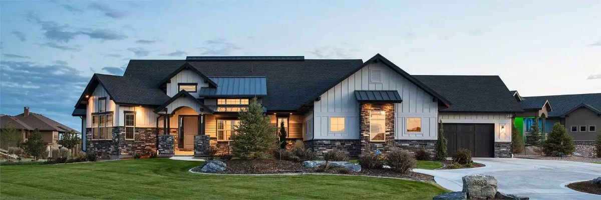 Wraparound Deck and Manicured Grounds Frame This Modern Farmhouse Rear Exterior