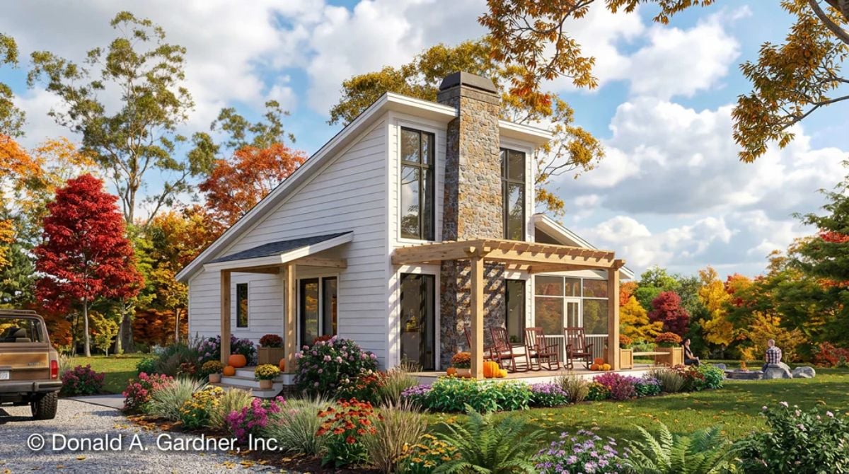 This tiny house features a modern roofline and a striking stone fireplace, creating a bold first impression in a compact footprint. The main living area is wrapped in walls of windows, filling the space with natural light and offering expansive views in every direction.
