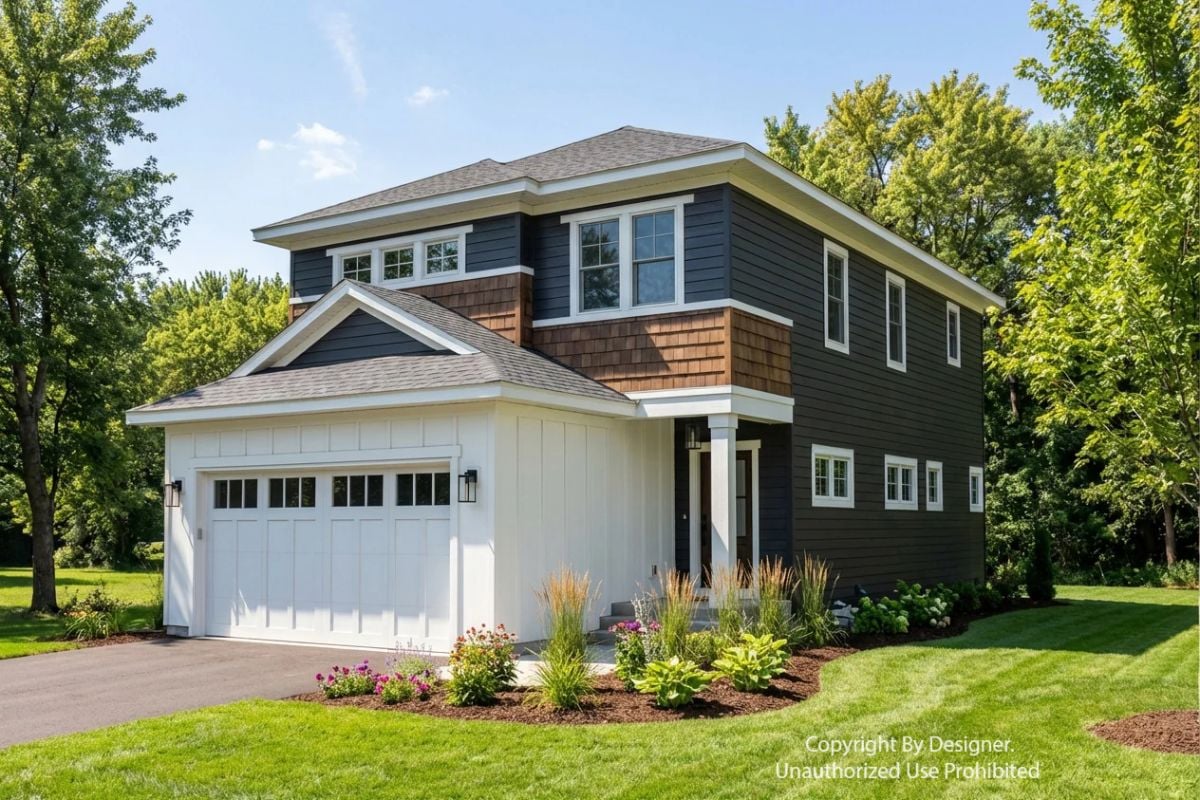 Outside, the two-story Craftsman exterior pairs dark siding with cedar shingle accents and a white double garage. Below, the main floor plan shows 797 square feet organized around a great room, open kitchen, dining area, mudroom, and attached two-car garage.