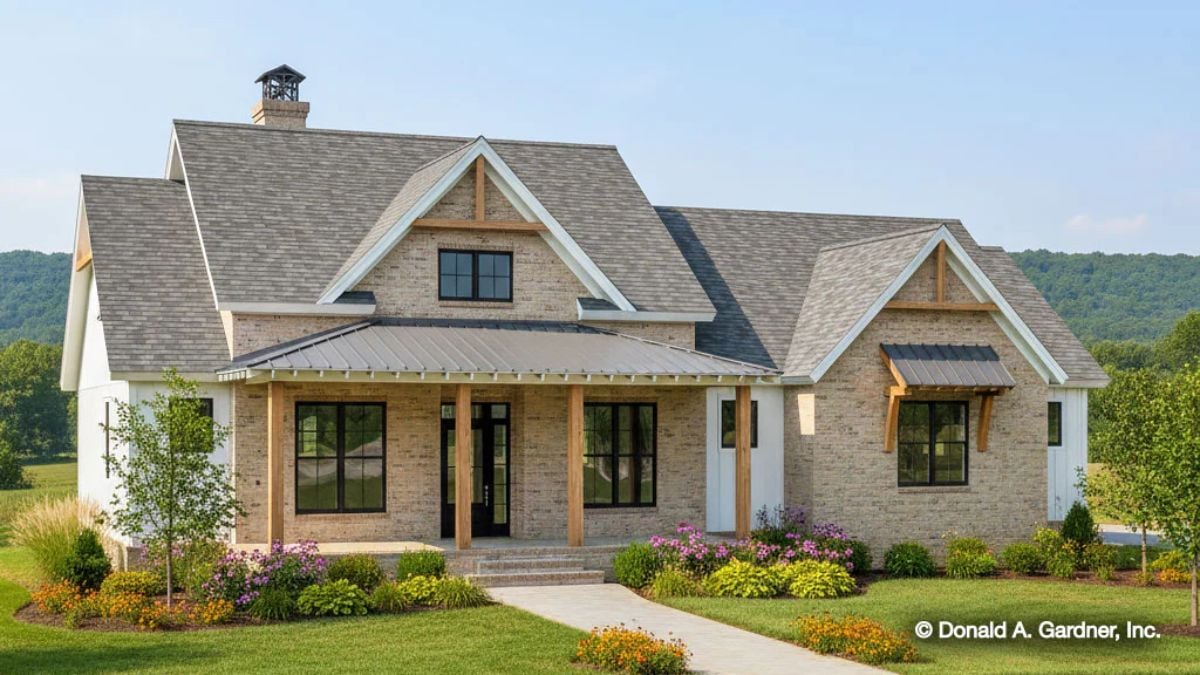 This modern farmhouse features a compact yet well-designed floor plan highlighted by a brick and board-and-batten exterior. Inside, the open layout centers on a vaulted great room with a fireplace, an island kitchen with a skylight and a nearby pantry, and both breakfast and dining areas for flexible everyday use.