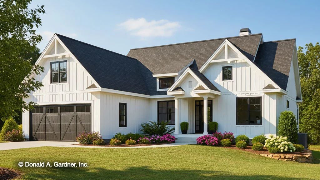 Clean lines and a crisp white exterior define this modern farmhouse, highlighted by bold gable brackets and a striking red front door that adds personality to the façade.