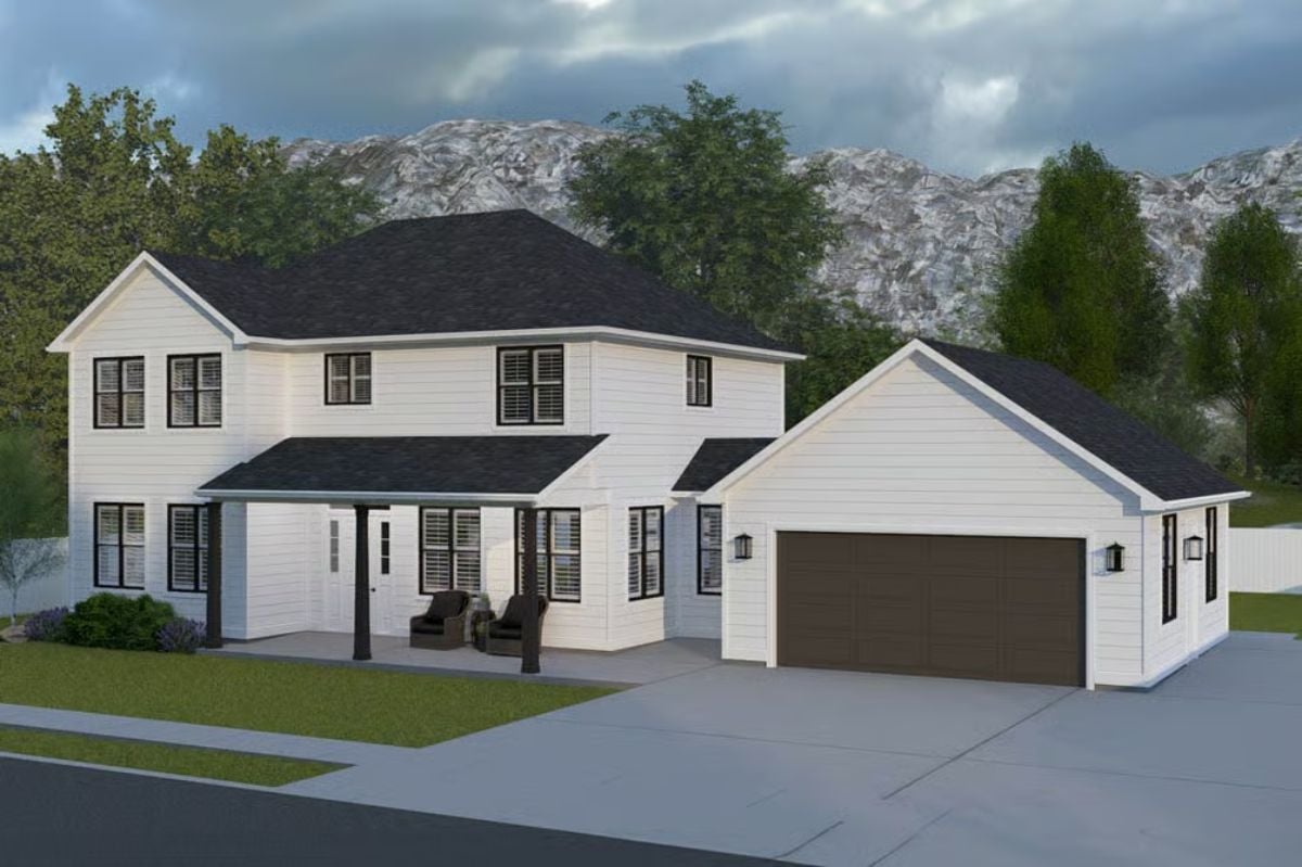 Trend Alert: Black-framed windows paired with white board-and-batten siding have become one of the most requested exterior combinations in new farmhouse construction. Covered outdoor living spaces like this one are increasingly being designed as true extensions of the interior, with ceiling fans, lighting, and furniture scaled for year-round use. Homebuyers are prioritizing functional outdoor rooms over decorative ones.