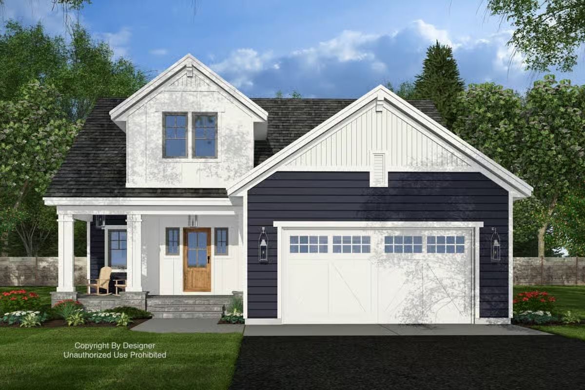 This traditional home features a classic, well-balanced exterior with simple gables, clean siding, and a welcoming covered front porch. The faรงade has a timeless, residential feel, with the attached garage thoughtfully integrated to maintain a cohesive and approachable street presence.