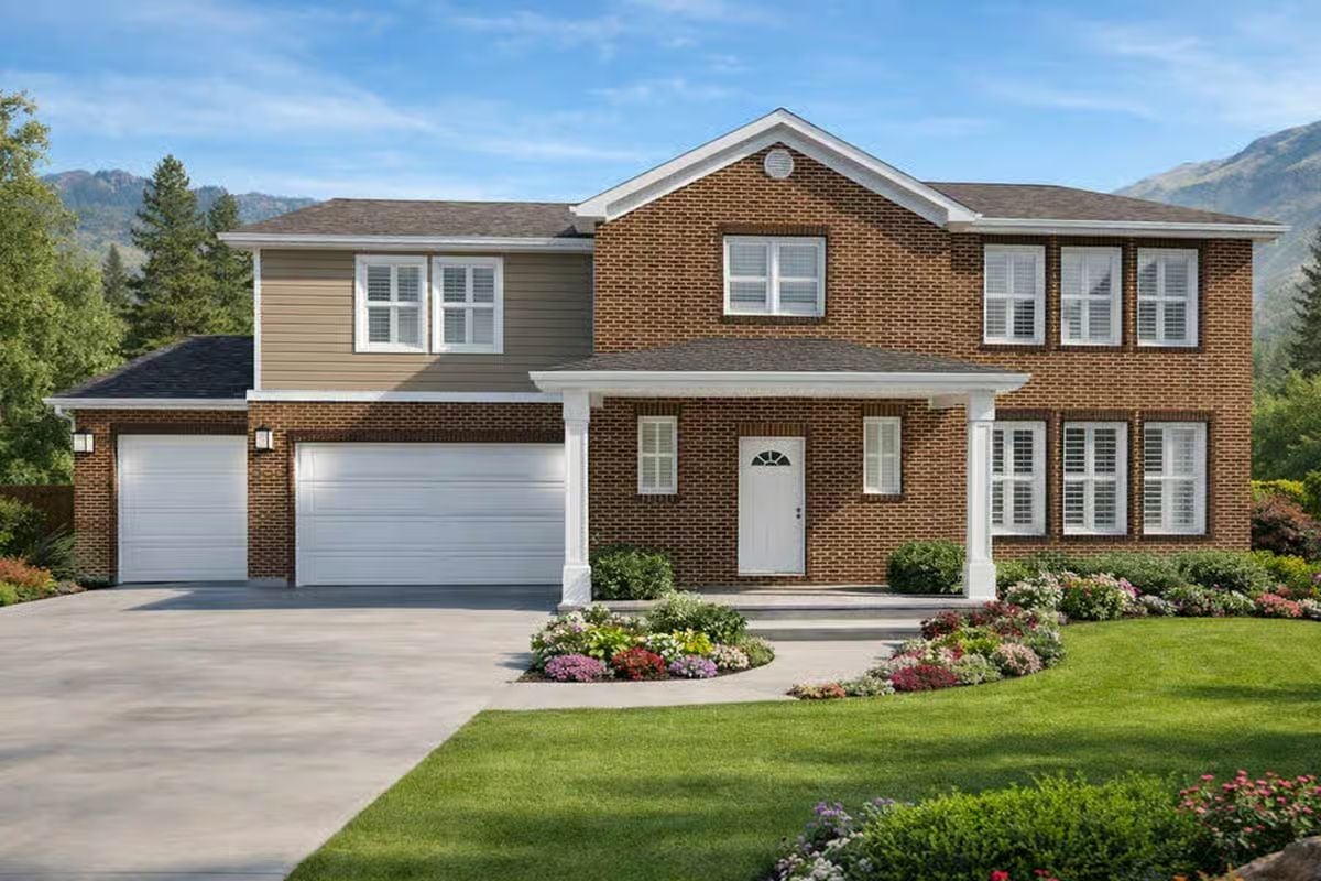 This traditional home features a classic brick exterior with crisp white trim and shutters, complemented by a welcoming covered front porch. The design includes an attached three-car garage, providing ample storage and parking space for a growing family.