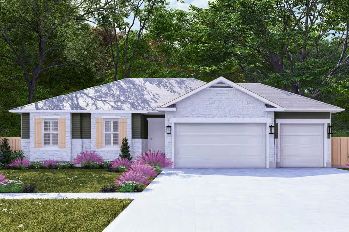 This traditional ranch features a clean, straightforward exterior with light masonry, simple rooflines, and an attached three-car garage that gives the home a balanced, practical presence. The front elevation is understated and functional, with a covered entry that clearly defines the arrival point without excess detail.