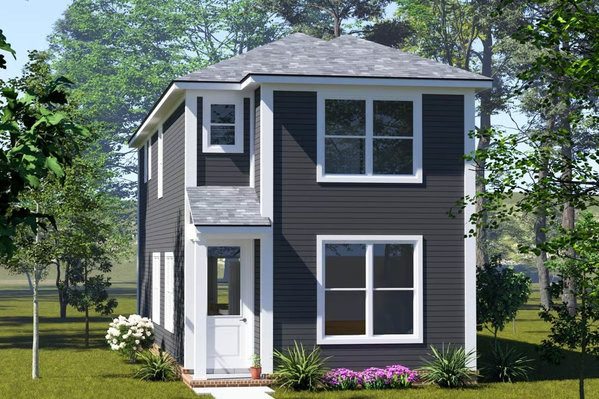 This compact two-story home presents a clean, contemporary exterior with strong vertical lines, simple roof geometry, and large windows that bring in natural light. The straightforward massing gives it a modern, urban-friendly presence while maintaining a residential scale.