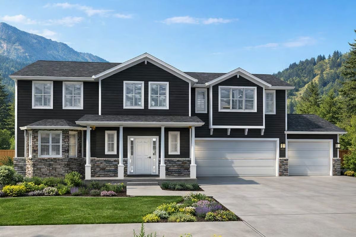 This traditional two-story home features clean horizontal siding, bold front-facing gables, and stone accents that add contrast and depth to the exterior. A covered front porch creates a welcoming entry, while the extended garage layout adds everyday practicality without overpowering the façade.