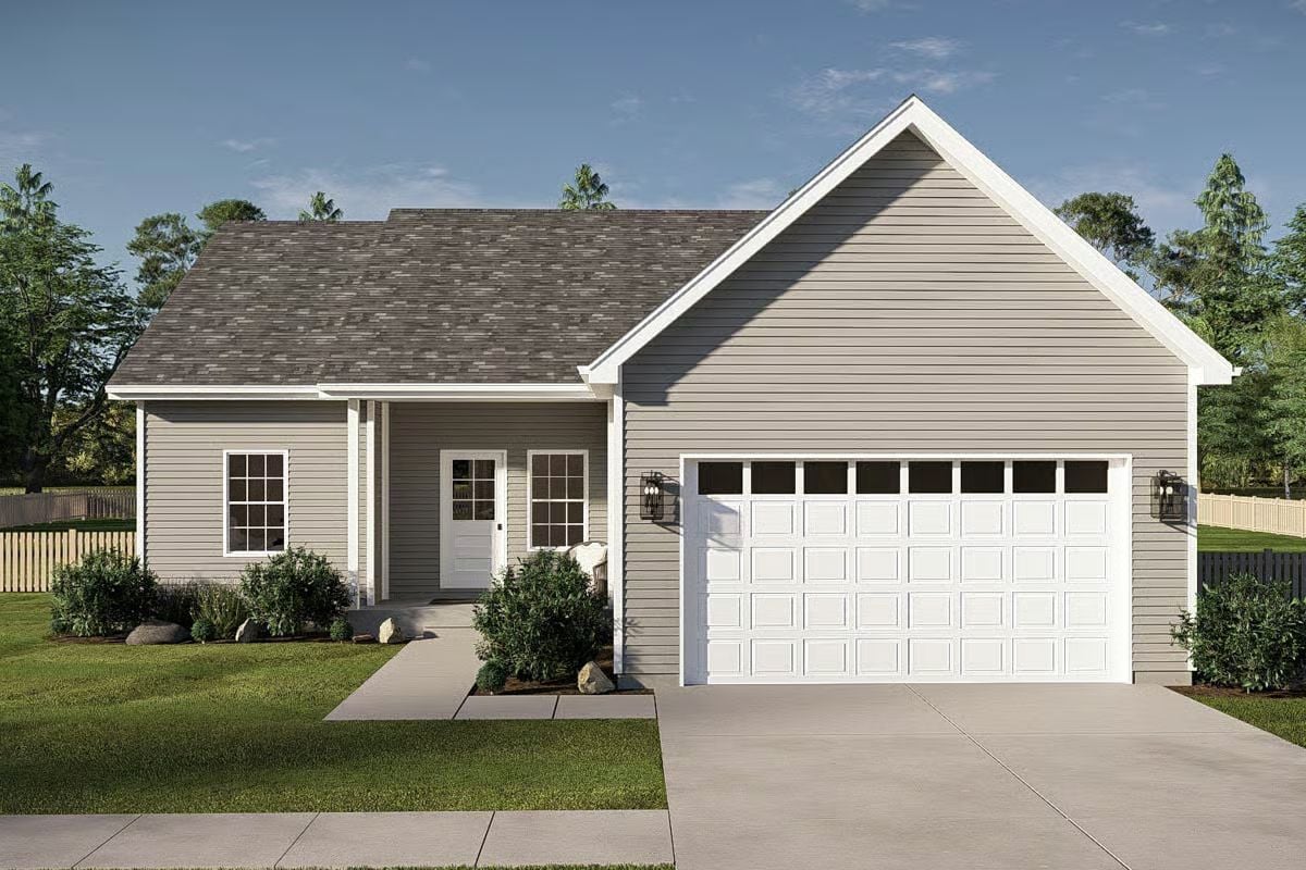This simple, traditional ranch design offers a clean exterior with classic siding, a welcoming covered entry, and an attached two-car garage that keeps everything convenient and easy to access. Its straightforward layout makes it a great fit for everyday living without unnecessary hall space or wasted square footage.