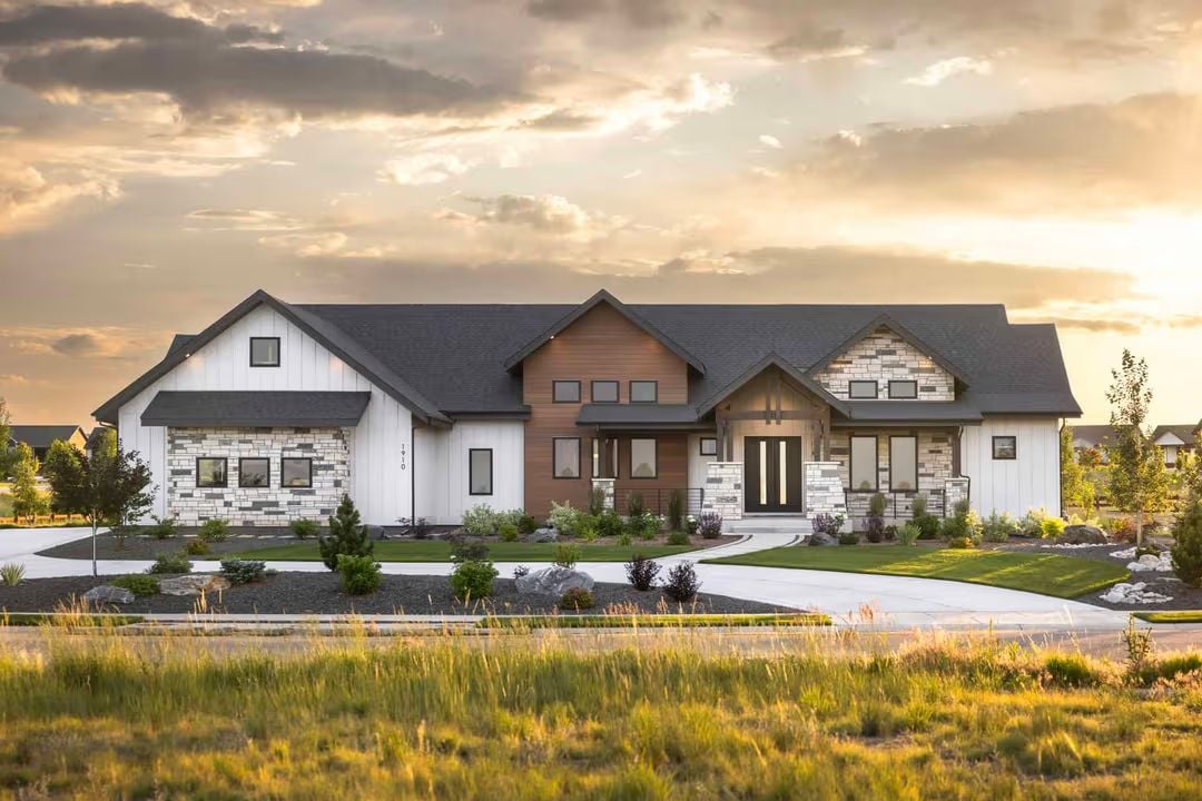 This transitional ranch combines mixed exterior textures with clean rooflines and a modern front entry that gives the home strong curb appeal. Stone accents, board-and-batten detailing, and warm wood tones work together to create a polished look that feels current without being overly modern.