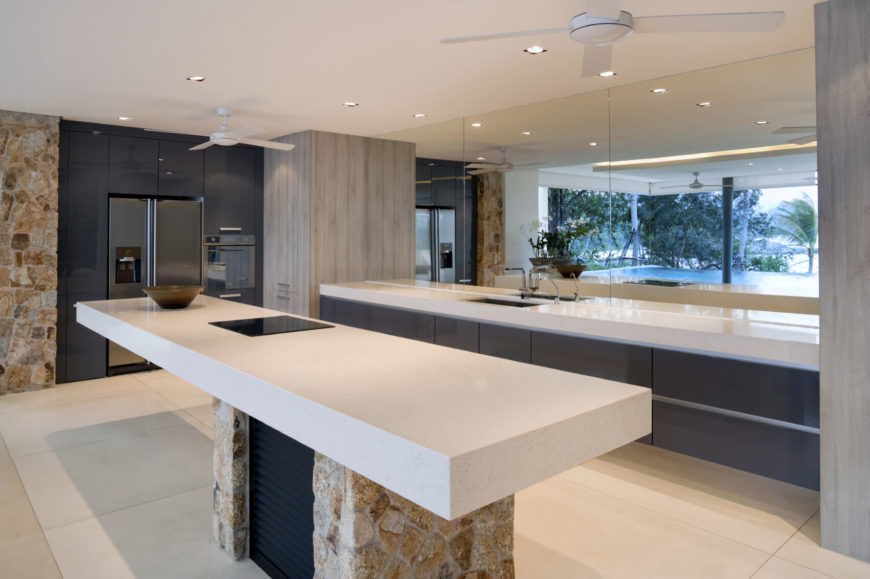 One of the home’s kitchens is a light, modern space with solid white countertops and minimalist cabinets. An expansive mirror above the sink makes the room seem much larger, and reflects a gorgeous view of the infinity pool.