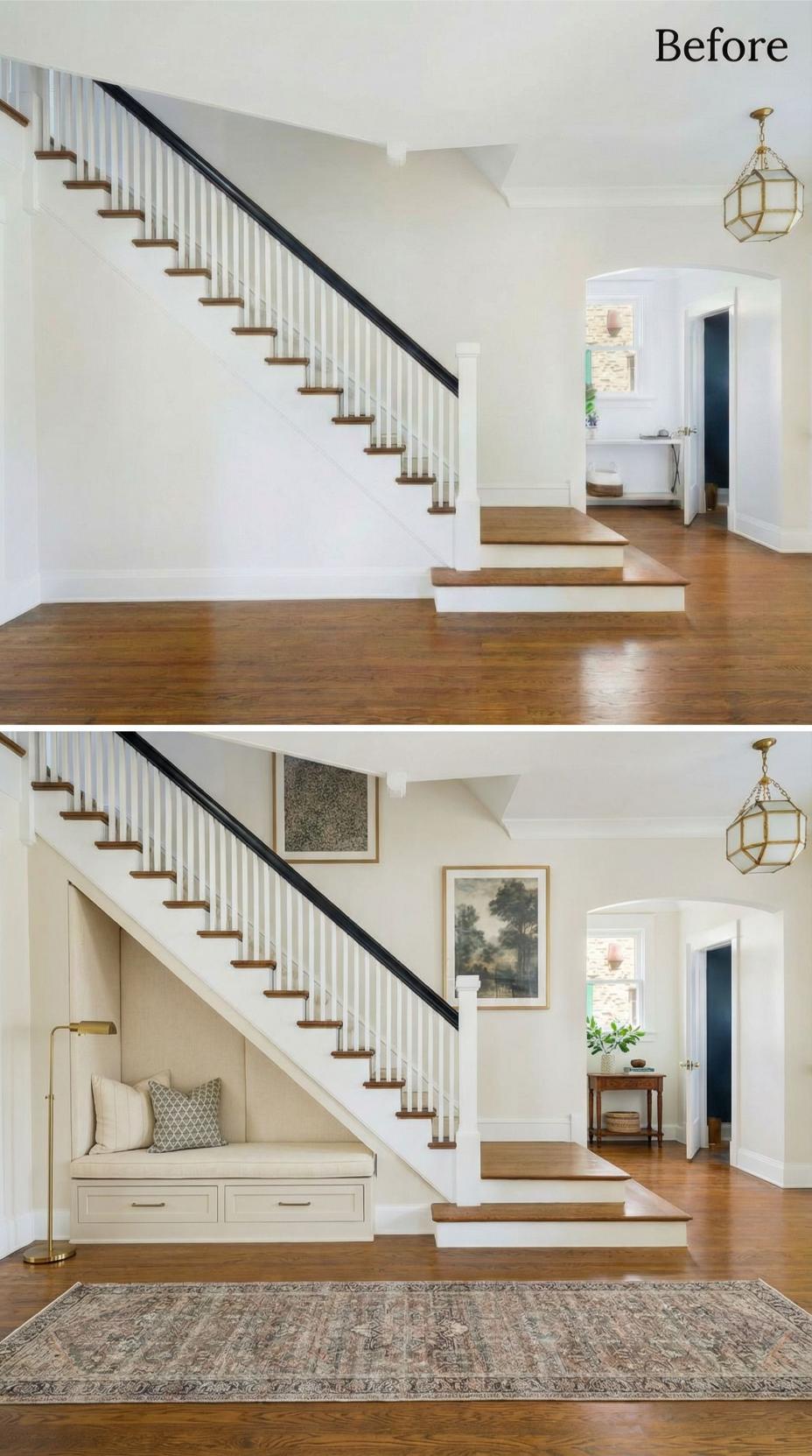 Clever built-in cabinetry transforms wasted space beneath the stairs into a highly organized storage solution. White shaker-style doors blend seamlessly with the existing millwork while maximizing every square inch. The addition of a streamlined bench and neutral area rug creates a welcoming entryway that combines style with smart functionality.