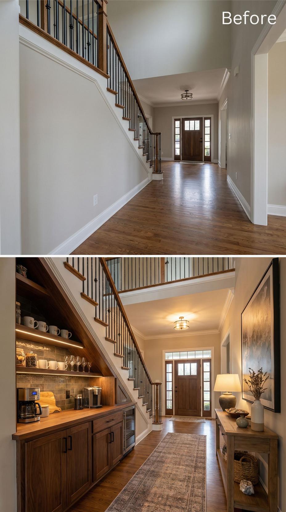 Previously empty walls beneath this staircase now showcase a sophisticated dual-function design. Dark walnut cabinetry creates a sleek coffee station with warm under-cabinet lighting, while a matching console table opposite provides stylish storage and display space. The transformation maximizes every inch of underutilized area, turning dead space into purposeful luxury.