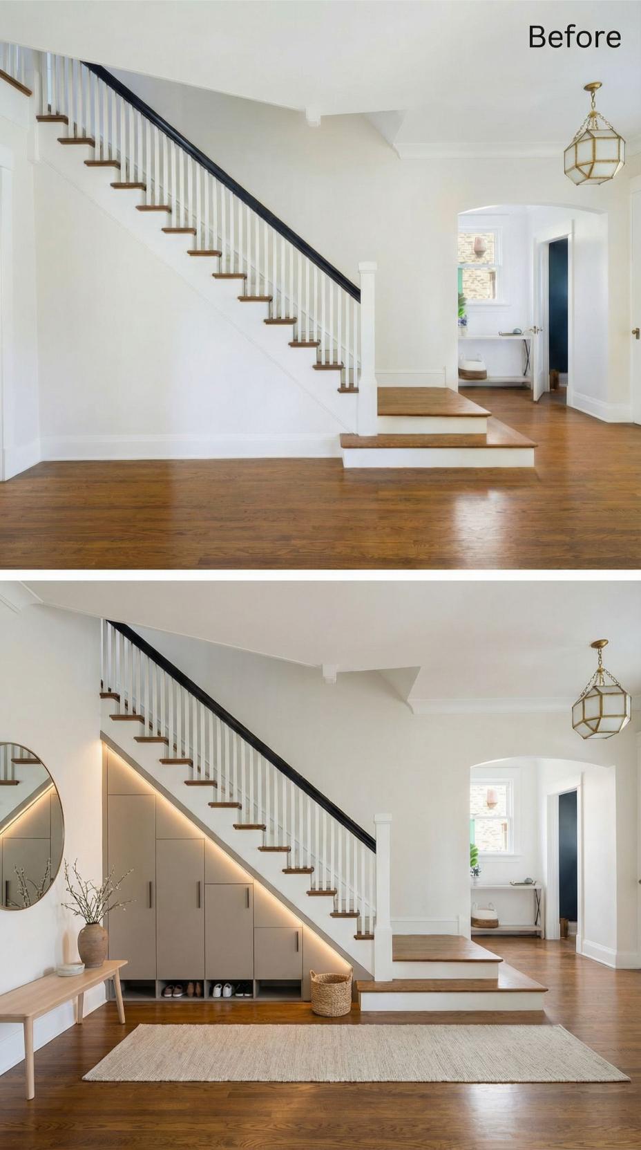 Built-in cabinetry with warm LED strip lighting completely transforms this plain walled-in staircase into a sophisticated storage solution. Sleek white panel doors create seamless concealed storage while maintaining clean lines throughout the entry. The integrated lighting adds ambiance and functionality, making the once-overlooked area a striking focal point that maximizes every square foot.