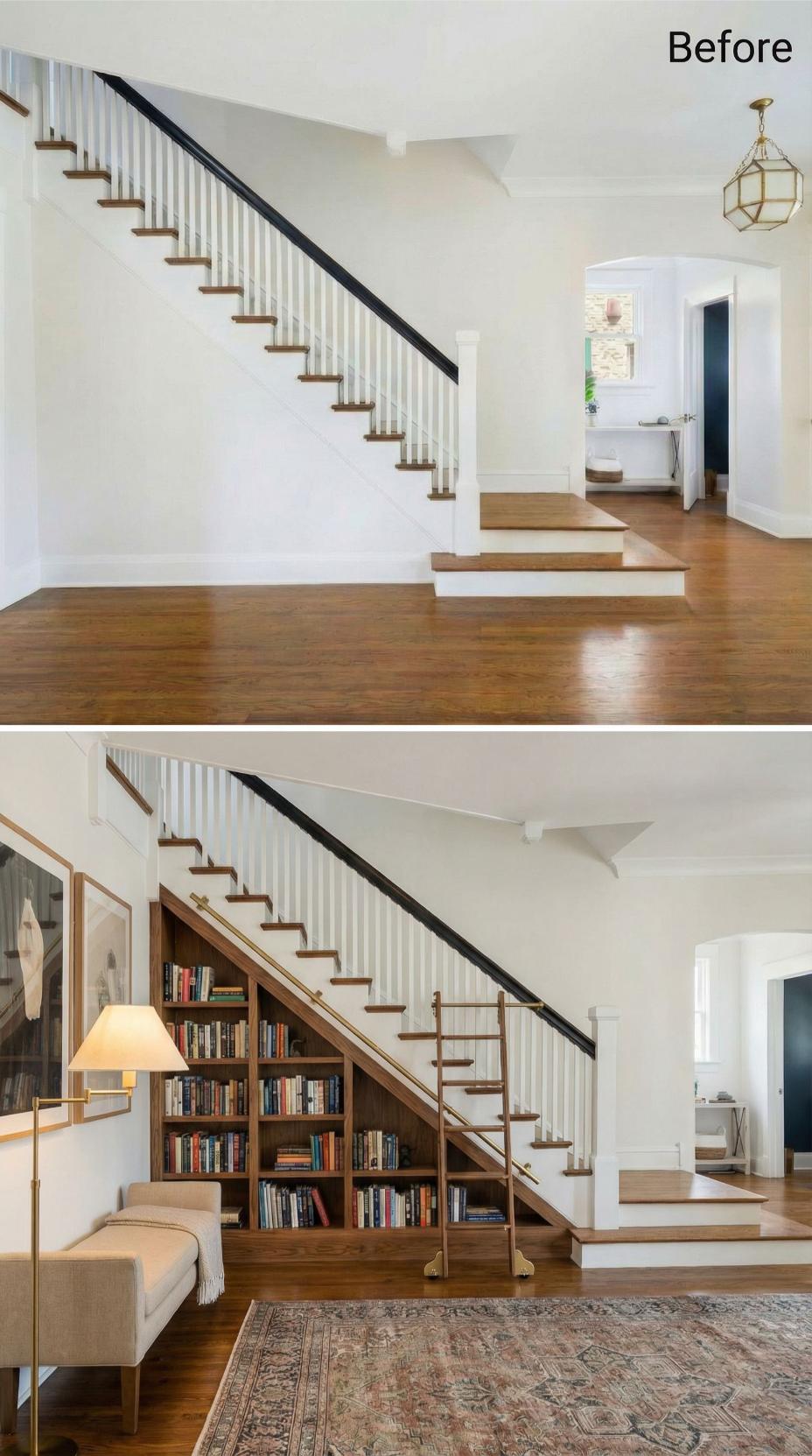 From Plain Walled-In Staircase to Built-In Library Storage Paradise