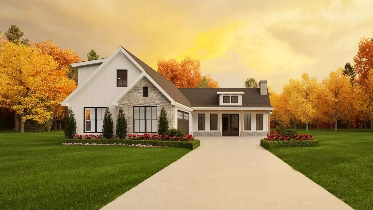 This farmhouse-style home features a welcoming exterior with a mix of stone and light siding, steep gables, and a long, low profile that feels both refined and approachable. The centered entry and varied rooflines give the front elevation depth and balance, while dark window accents provide contrast and definition. The attached garage is positioned to the side, keeping the focus on the main living spaces and entry.