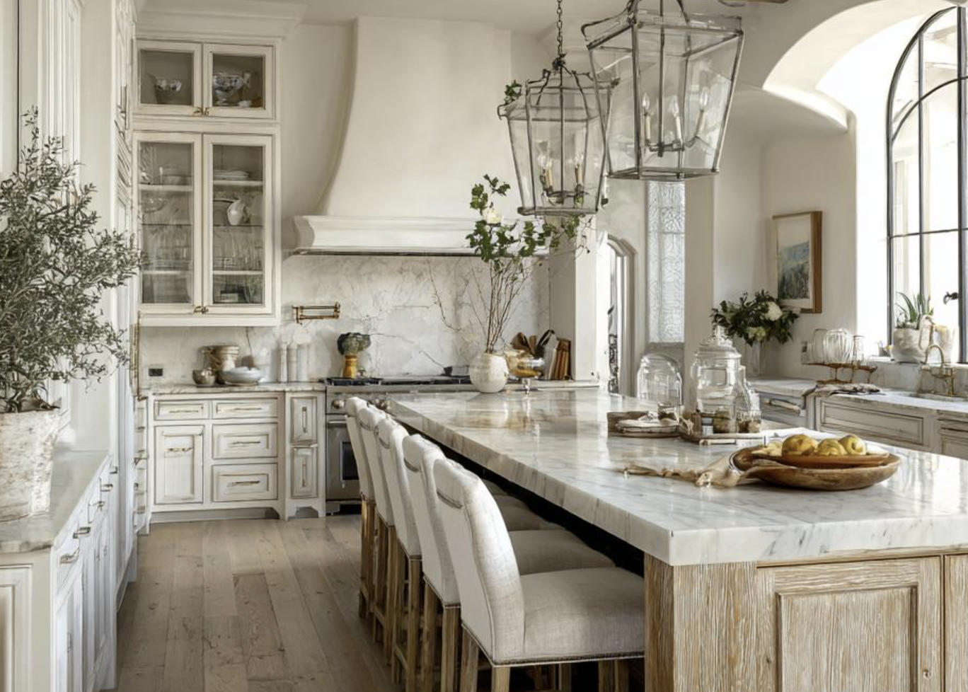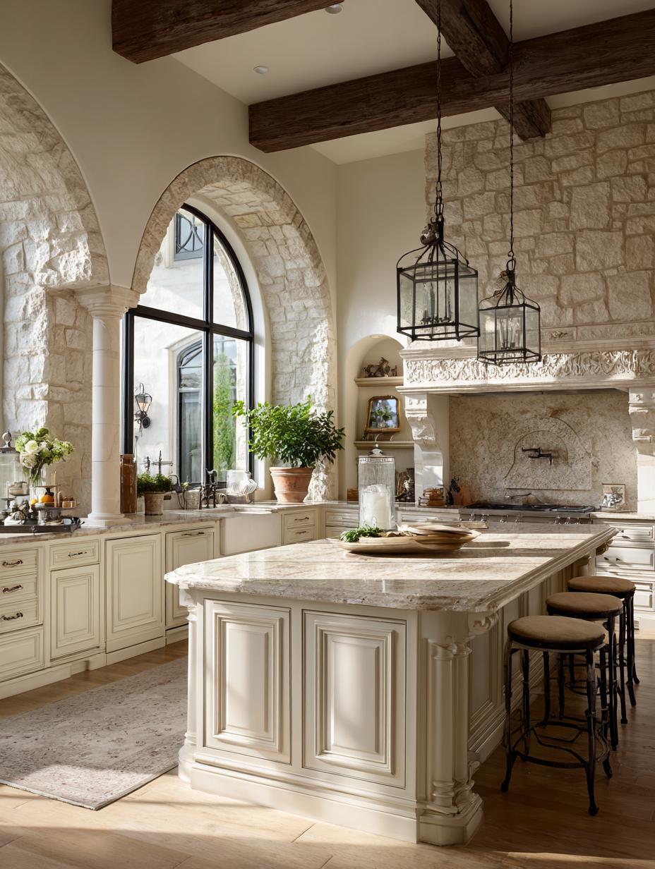 Mediterranean Stone Arches Meet Creamy Cabinet Sophistication