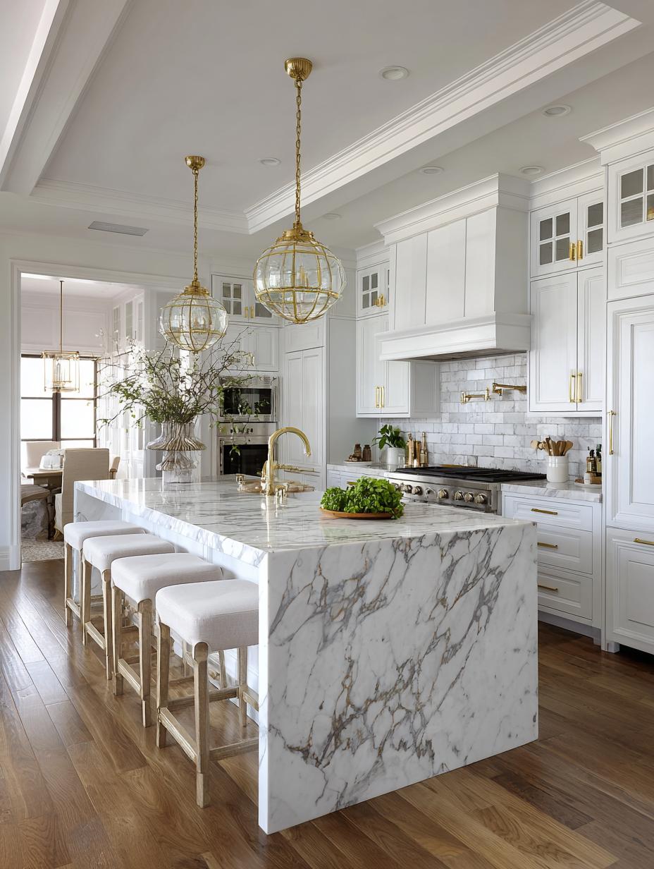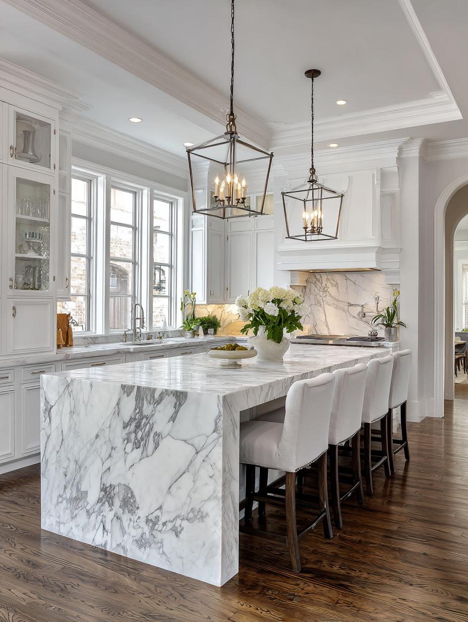 Marble Waterfall Island Commands Attention in Classic White Kitchen