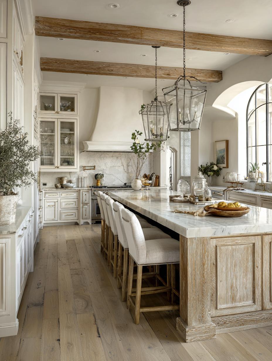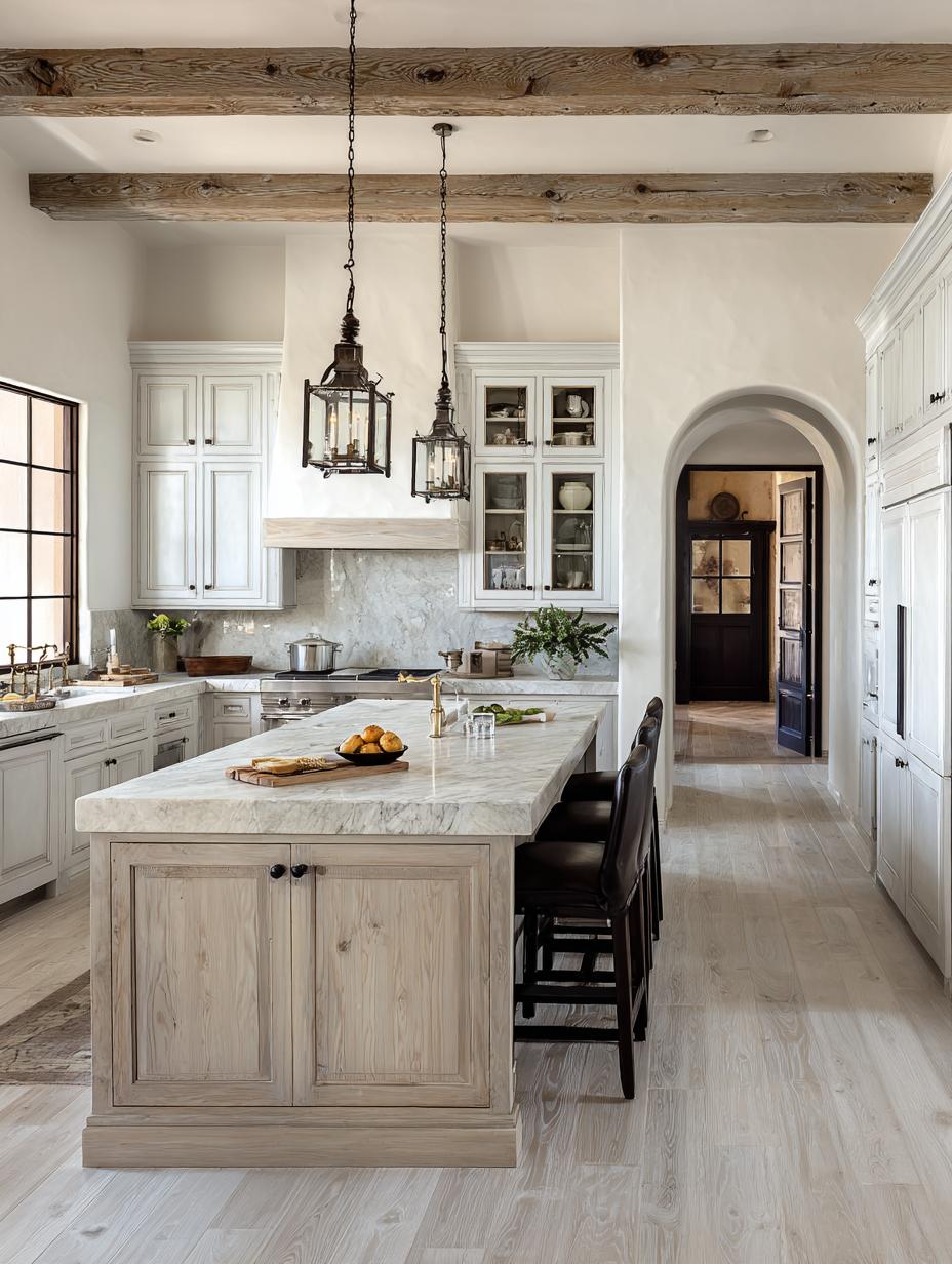 Weathered wood beams crown this sophisticated kitchen where creamy white cabinetry pairs beautifully with natural oak elements. The marble-topped island anchors the space while vintage-inspired lantern pendants cast warm light across pristine countertops. Glass-front upper cabinets showcase curated dishware, and the arched doorway adds architectural interest that complements the room’s refined farmhouse aesthetic perfectly.