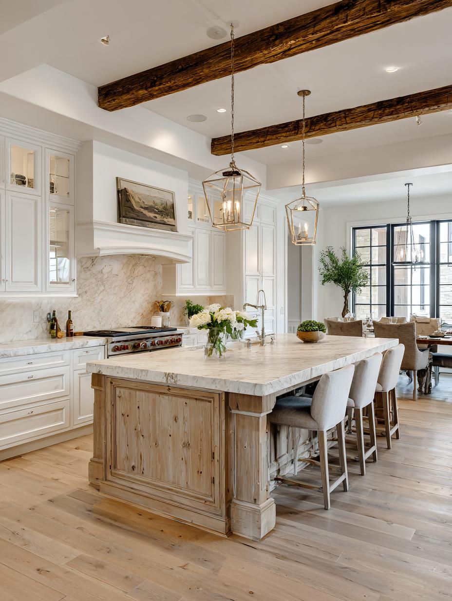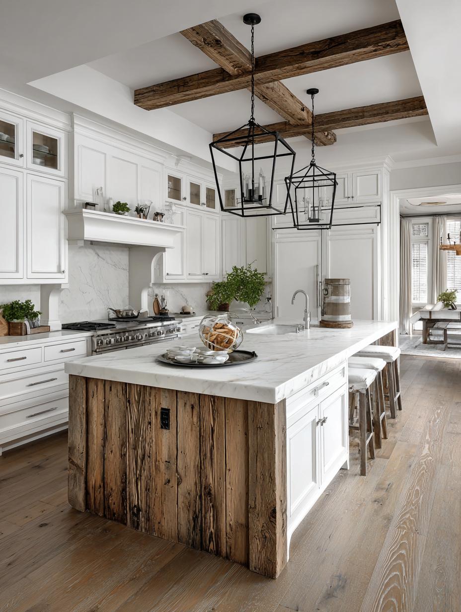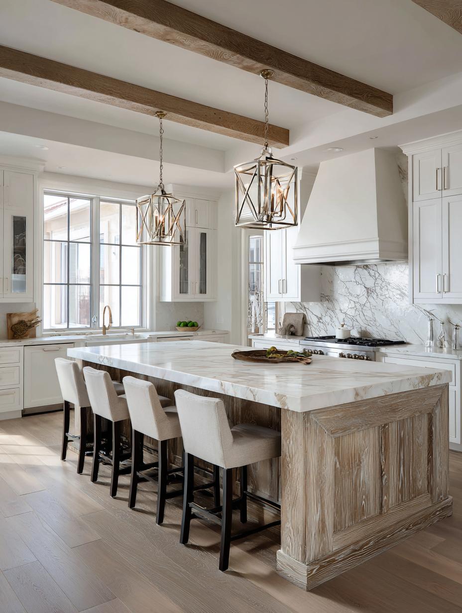 Rustic Beams Meet Marble Luxury in Contemporary White Kitchen