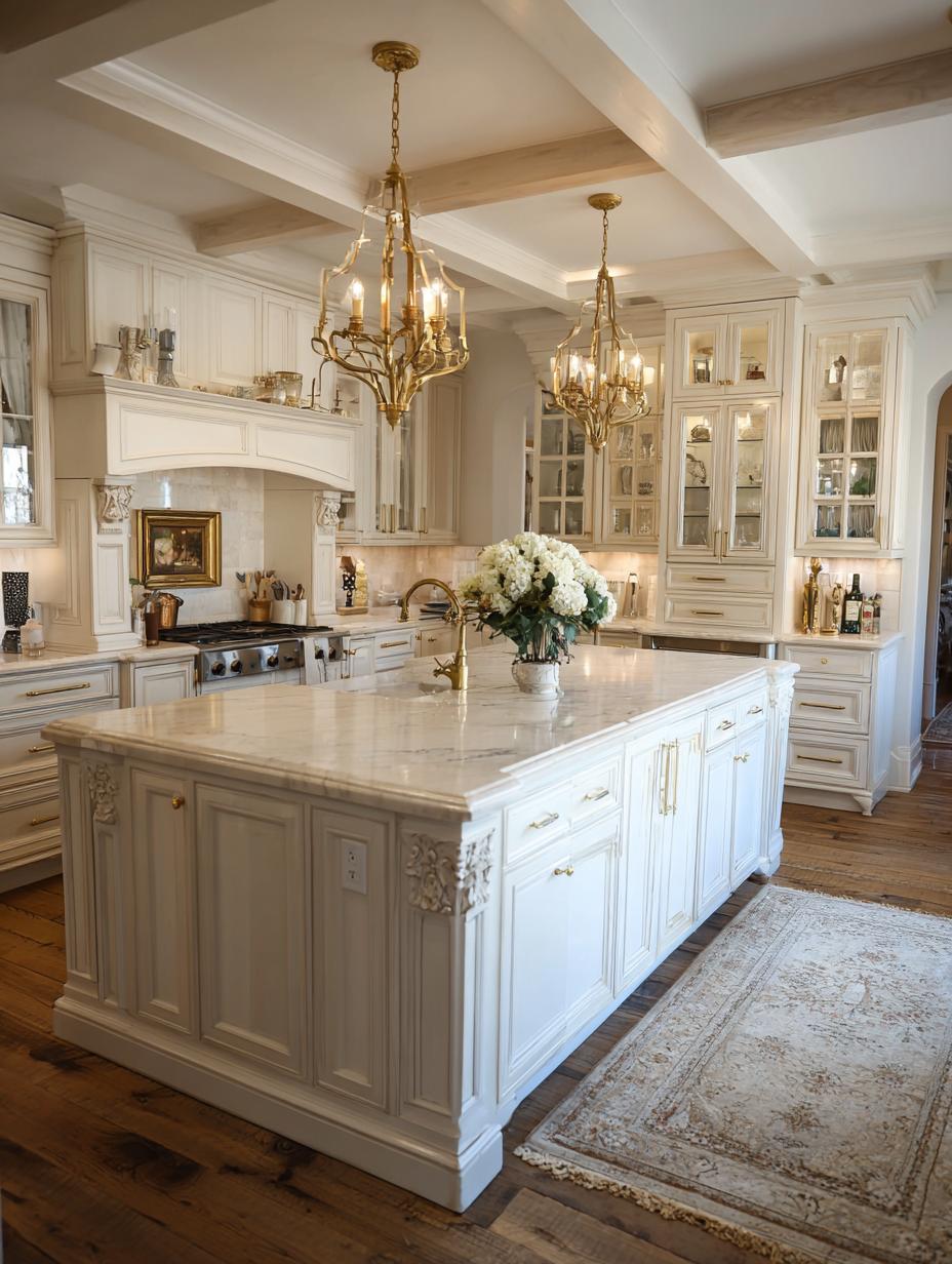 Ornate brass chandeliers cast warm light across this sophisticated kitchen where coffered ceilings create architectural drama overhead. Custom white cabinetry features intricate carved details and glass-front displays, while marble countertops provide luxurious work surfaces. The expansive island anchors the space with decorative moldings and brass hardware that echoes the statement lighting above.