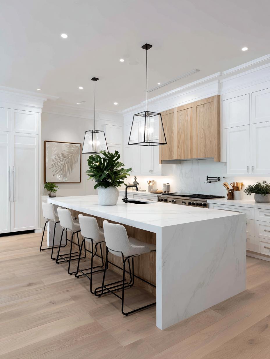 Natural wood upper cabinets create stunning visual contrast against crisp white base cabinetry and marble-look countertops. Geometric pendant lights cast warm illumination over the waterfall island, while white bar stools with black metal frames provide sleek seating. Light hardwood floors anchor the space, complementing the wood-tone elements and enhancing the kitchen’s sophisticated two-tone palette that feels both modern and inviting.