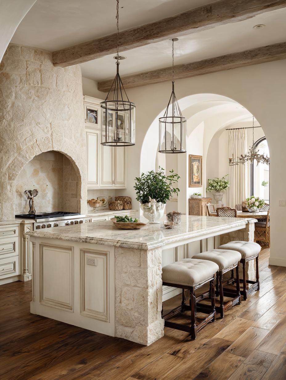 Natural limestone creates stunning texture through the arched range hood and waterfall island base, while reclaimed wood beams add warmth overhead. Cream-painted cabinetry with traditional panel details balances the raw materials beautifully. Lantern-style pendant lights illuminate the marble countertops, where three upholstered counter stools provide comfortable seating. Wide-plank hardwood floors and an arched doorway complete this sophisticated Mediterranean-inspired design.