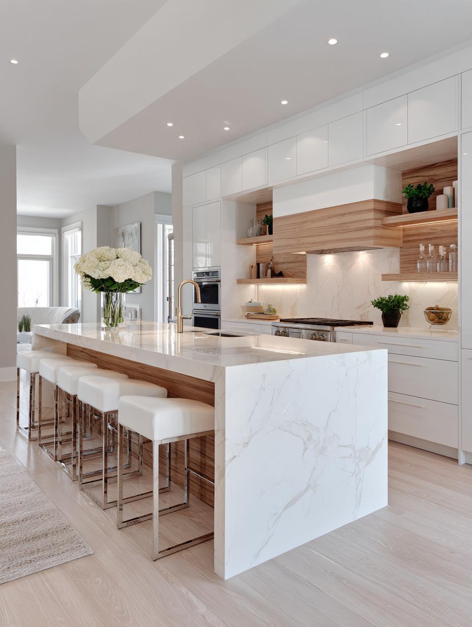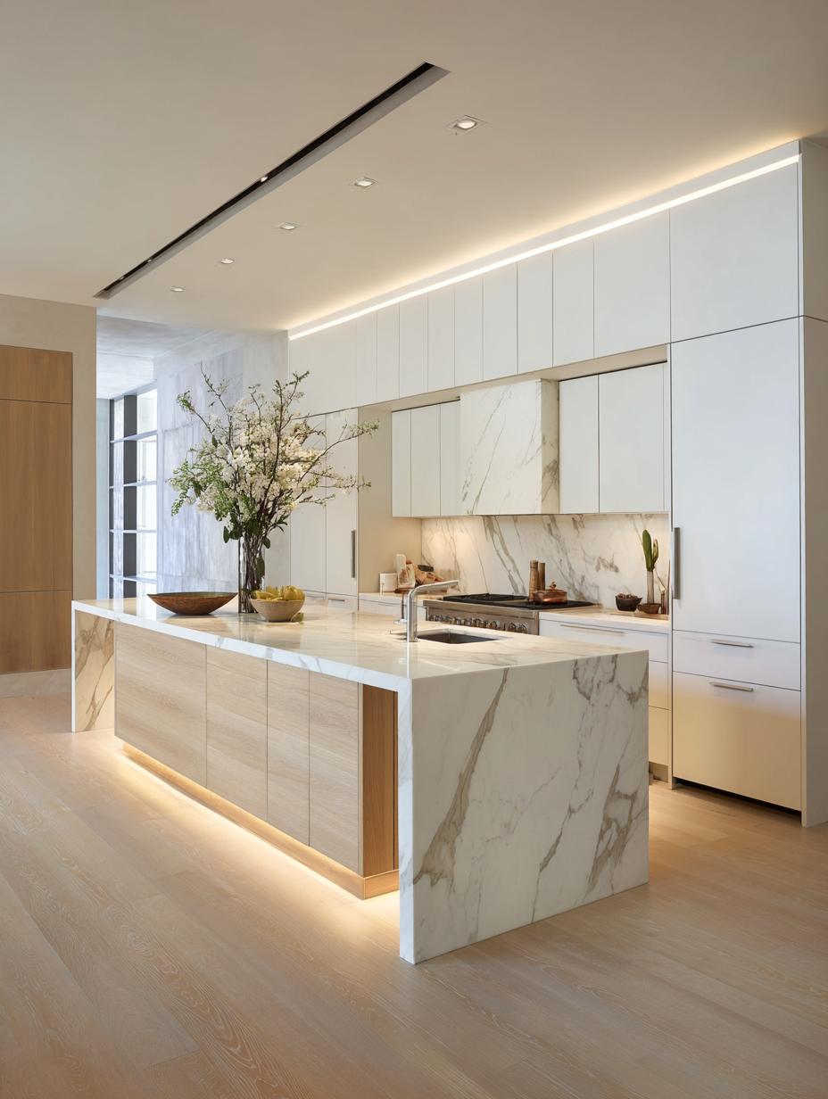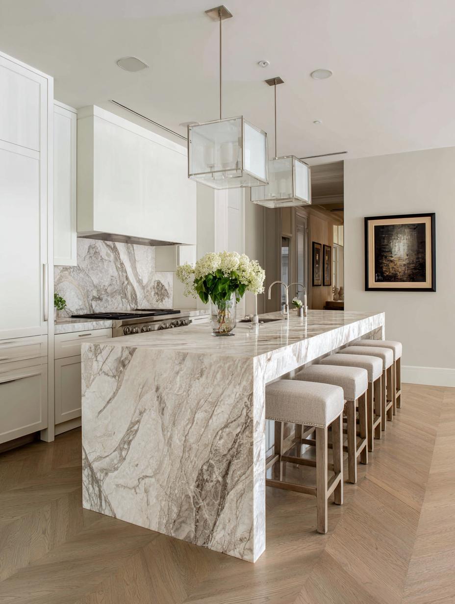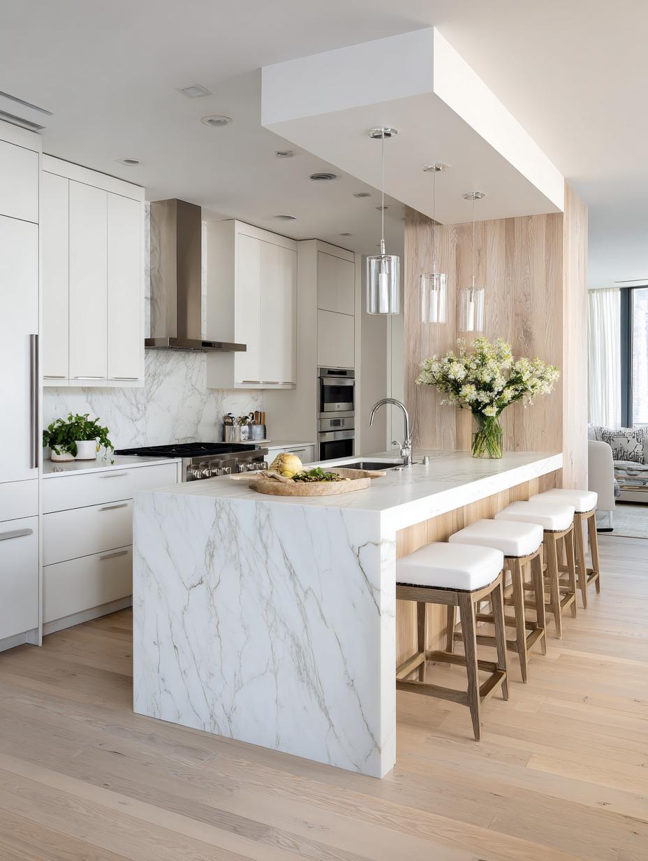 Marble Waterfall Island Creates Stunning Focal Point in Contemporary Design