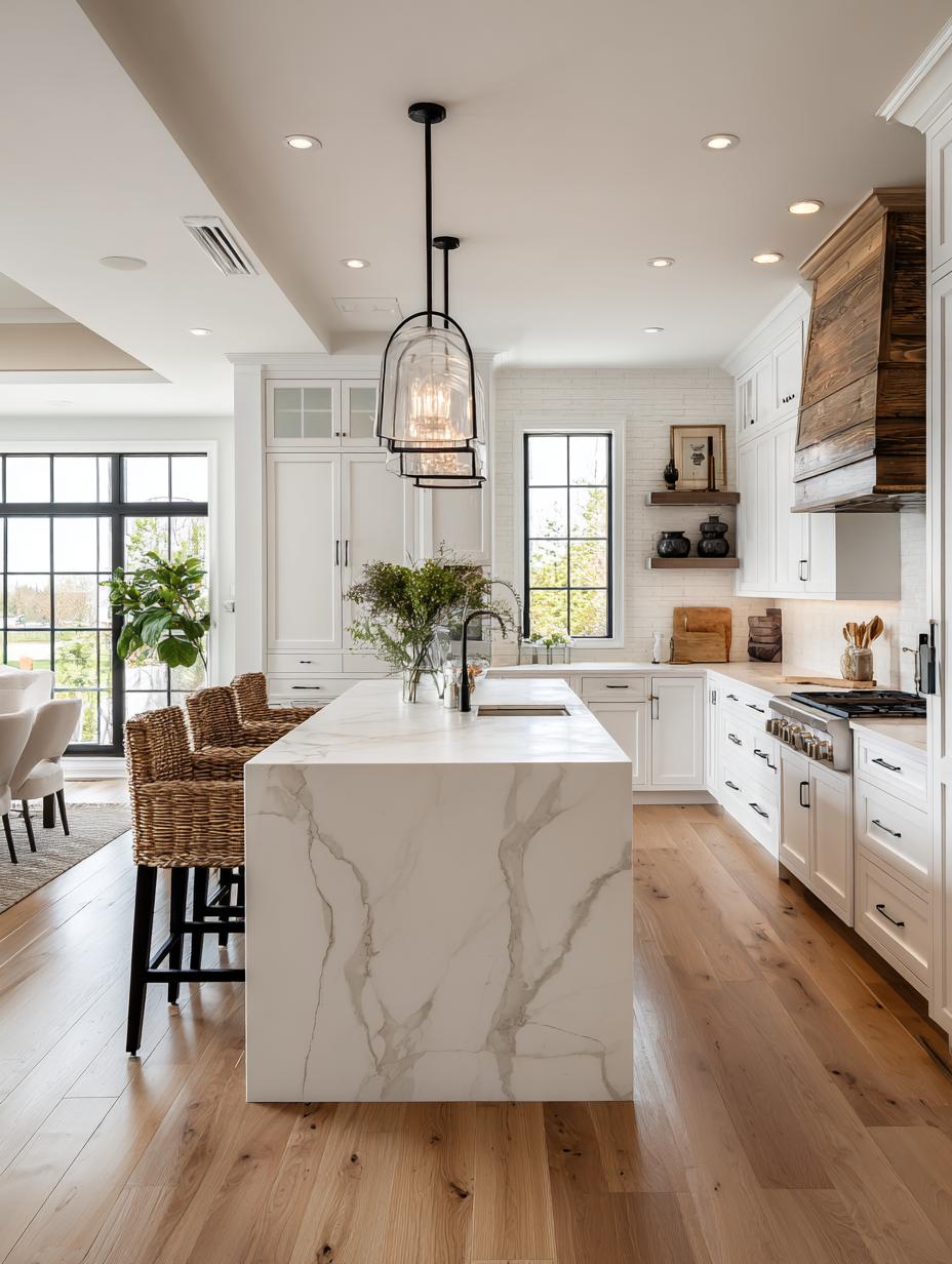 Marble Waterfall Island Commands Modern Farmhouse Excellence