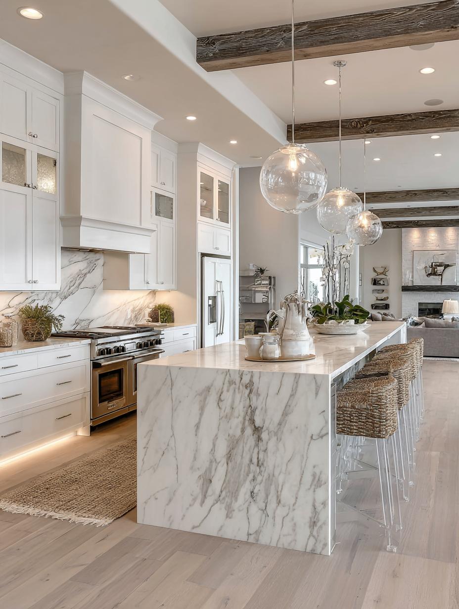 Weathered wooden ceiling beams create stunning contrast against pristine white cabinetry and luxurious marble surfaces throughout this sophisticated kitchen. Clear glass globe pendants illuminate the waterfall-edge island, while woven bar stools add natural texture. Under-cabinet lighting enhances the marble backsplash’s dramatic veining, and polished floors reflect the abundant natural light streaming through multiple windows.